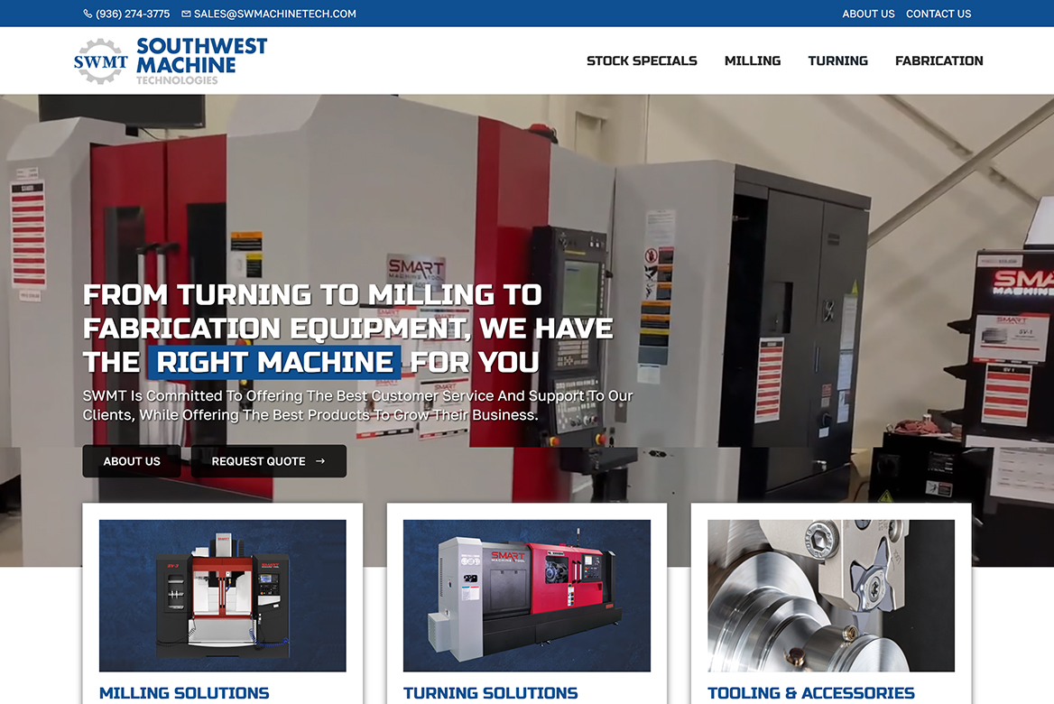 Southwest Machine had built a strong reputation as a trusted CNC machine dealer serving manufacturers throughout Texas. As the exclusive regional dealer for Smart Machine Tool and HNK, they offer high-performance CNC milling machines and CNC lathes used by job shops, production facilities, and precision manufacturers alike. However, their previous website did not clearly reflect the depth of their product offerings, dealer exclusivity, or technical expertise.